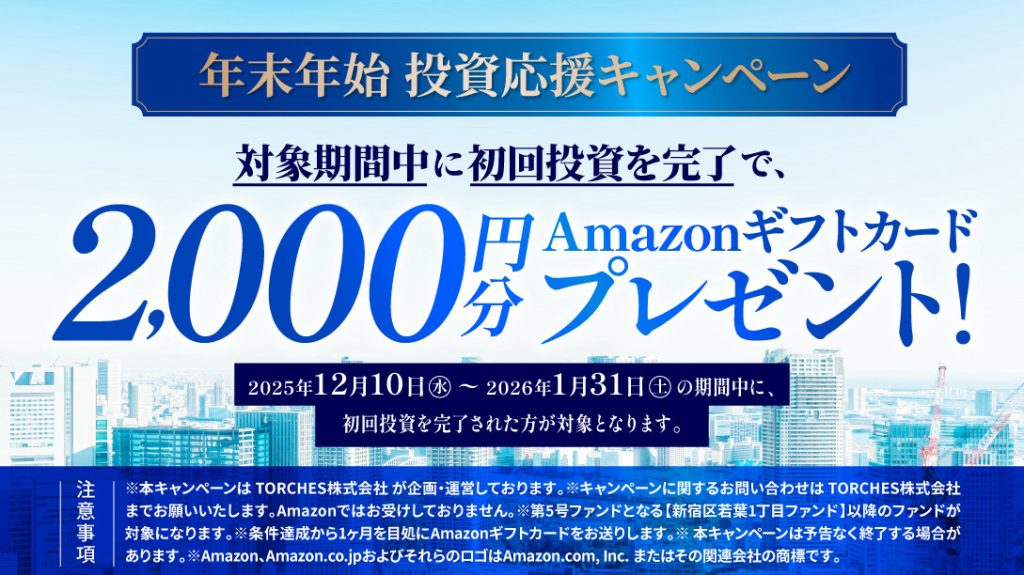 なお、2025年11月にサービスを開始した不動産クラファン「トーチーズ」では、2026年1月までの新規登録&初回投資で2,000円分のAmazonギフトカードをもらえるという特大キャンペーンを実施中です。