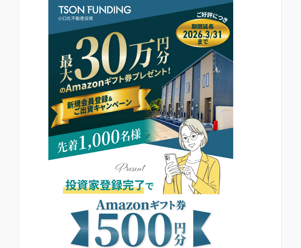 また2026年3月31日まで、無料の投資家登録で500円分のAmazonギフト券がもらえるキャンペーンを実施中です。さらに、出資金額に応じて最大30万円分のAmazonギフト券も追加でもらえます。まずは下記から確認してみてくださいね。