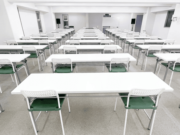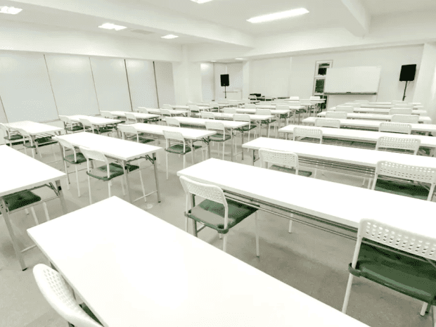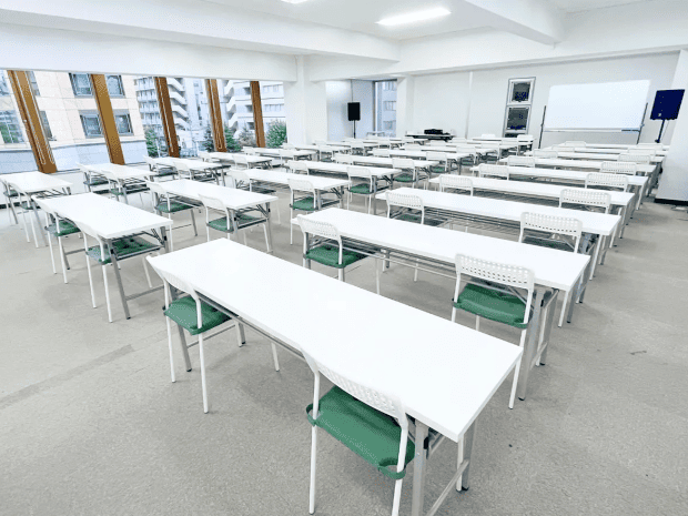 スクール形式、ロの字形式、シアター形式など、多様な机配置から用途に適したレイアウトをご提案。ご利用前に無料でレイアウトの設営を行います。お気軽にご相談ください。