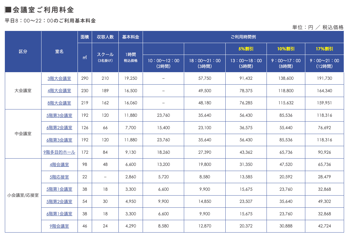 ※ご予約は、中小会議室及び応接室【2時間】・大会議室【3時間】からのご利用をお願いいたします。以降は30分単位でご予約可能です。