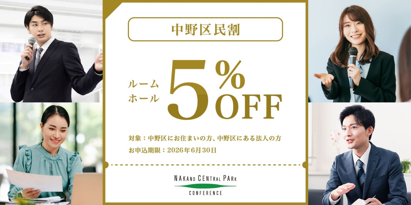 中野区にお住まいの方、中野区にある法人の方限定、ホール・ルームご利用で室料5%オフ