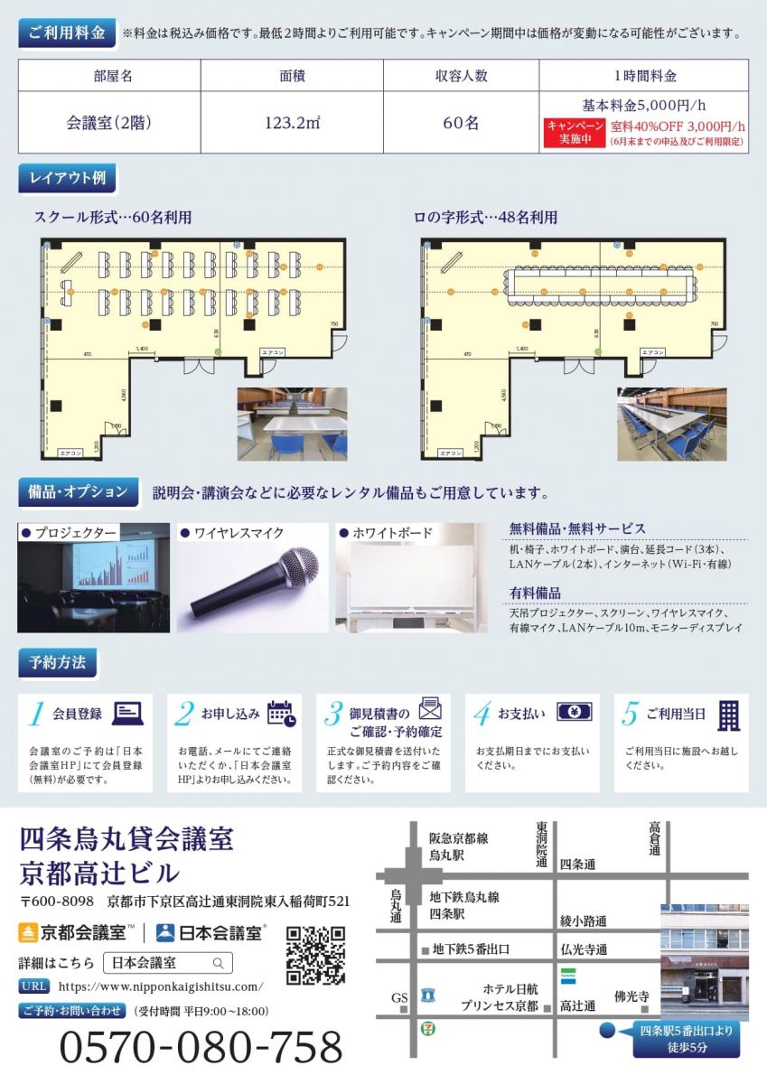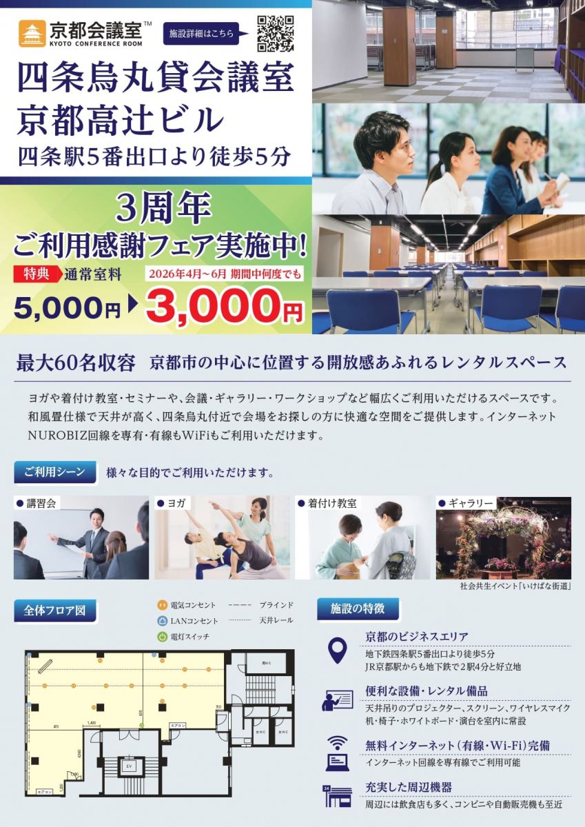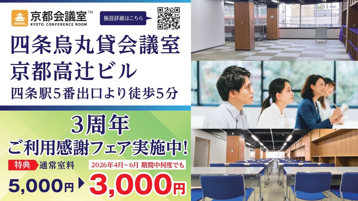 【四条烏丸貸会議室京都高辻ビル】室料40%オフ!3周年ご利用感謝フェア